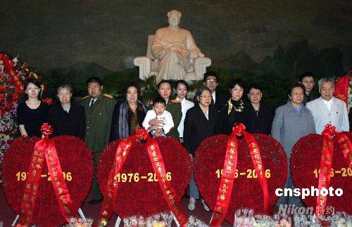 資料圖為2006年9月9日毛澤東逝世三十周年紀念日,毛澤東的親屬匯聚位于北京天安門廣場的“毛主席紀念堂”敬獻鮮花。劉思齊(左二,毛澤東長子毛岸英之妻)、毛新宇(左三,毛澤東之孫)、邵華(左四,毛澤東之子毛岸青妻子)、毛東東(左五,毛澤東重孫)、劉濱(左六,毛澤東孫媳婦)、李敏(左八,毛澤東女兒)、孔繼寧(左九,毛澤東外孫)、孔東梅(左十,毛澤東外孫女)、李訥(右三,毛澤東女兒)、王孝芝(右二,毛澤東外孫)、王景清(右一,毛澤東女婿)等獻花后,在毛澤東塑像前合影。中新社發 任晨鳴 攝