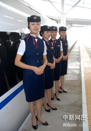 乘務(wù)員都是經(jīng)過重重選拔,外形條件業(yè)務(wù)素質(zhì)都比較高,她們甜美的微笑吸引了很多記者的鏡頭。王紅綱 攝