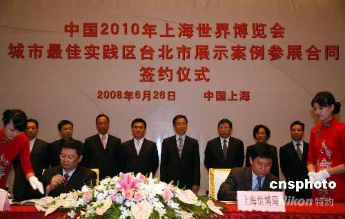 6月26日晚,臺北市簽約參展二0一0年上海世博會,臺北案例參展總協(xié)調(diào)人脫宗華代表臺北市與上海世博局洪浩局長,在上海西郊賓館簽署參展合同,臺北市市長郝龍斌、上海市市長韓正、上海市副市長楊雄、鴻?萍技瘓F暨富士康科技集團董事長郭臺銘等作為簽約見證人,出席簽約儀式。中新社發(fā) 潘索菲 攝