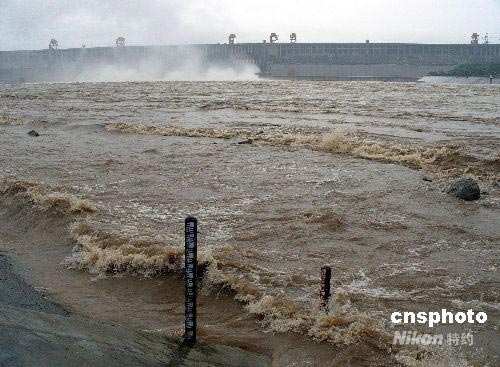 2008年7月5日,大雨中的三峽大壩開啟6個深孔泄洪,每秒下泄流量11000立方米,這是三峽工程2008年首次開閘泄洪。連日來,長江三峽庫區持續大到暴雨,長江上游來水猛漲,7月5日10時三峽入庫流量達34500立方米/秒,三峽壩前水位為145.79米。據長江防汛抗旱總指揮部披露,預計未來幾天長江上游仍將持續降雨,三峽入庫流量將持續超過26000立方米/秒,三峽大壩將保持持續泄洪狀態。中新社發 劉君鳳 攝