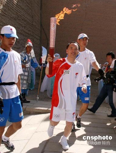 韓國籍第202棒火炬手李賢求在嘉峪關關城內進行傳遞。中新社發 周兆軍 攝