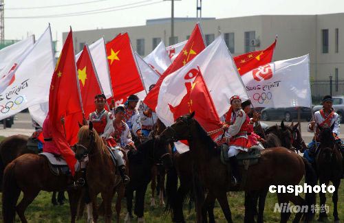 7月8日,奧運火炬在呼和浩特傳遞,呼和浩特民眾在馬背上為奧運加油。 中新社發 廖攀 攝