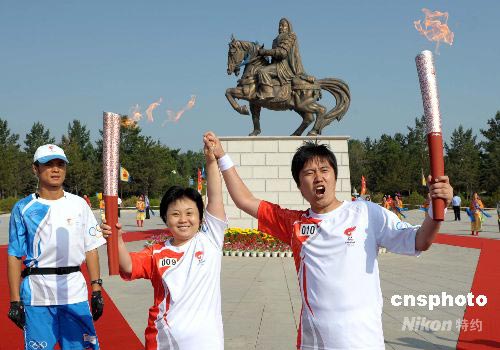 7月9日,奧運火炬在內(nèi)蒙古鄂爾多斯進行傳遞。傳遞起跑儀式在成吉思汗陵前舉行,火炬手李霽、王恒在成吉思汗雕像前交接火炬。中新社發(fā) 廖攀 攝