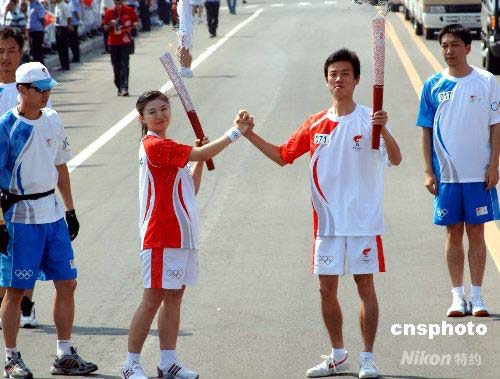7月9日,奧運火炬在內(nèi)蒙古鄂爾多斯進行傳遞。圖為火炬手黃逸捷、朱小芳正在交接火炬。中新社發(fā) 廖攀 攝