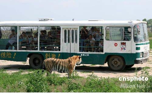 7月10日,在哈爾濱的東北虎林園,一只東北虎與坐在游覽車內的游人相互張望。中新社發 周兆軍 攝