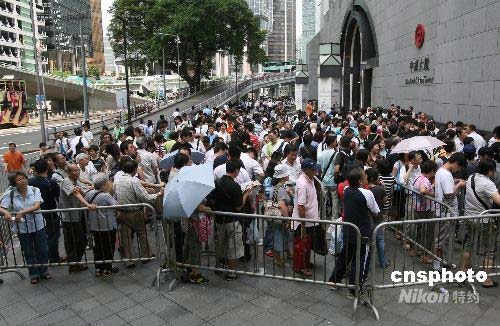 七月十五日,數(shù)千香港市民在中銀香港總部外等待領(lǐng)取奧運(yùn)紀(jì)念鈔票購(gòu)物憑證。三百七十六萬(wàn)張港幣奧運(yùn)紀(jì)念鈔票十六日才發(fā)售,但在開售前的五十小時(shí),已有數(shù)以千計(jì)的市民前往中銀相關(guān)分行外排隊(duì)等候。中新社發(fā) 武仲林 攝