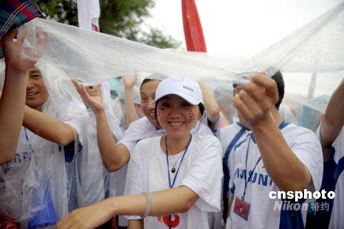 圖:延吉女大學生雨中為北京奧運加油