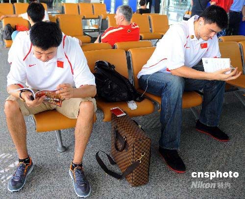 在北京機場候機時,中國男籃的“擎天拄”姚明與王郅治看書消磨時光。中新社發 任晨鳴 攝