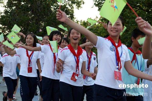 7月20日,位于黑海岸邊的全俄“雛鷹”兒童中心舉行今年第八期夏令營開營儀式,并隆重歡迎來此療養(yǎng)的四川地震災(zāi)區(qū)的中小學(xué)生代表團(tuán)。圖為四川地震災(zāi)區(qū)中小學(xué)生入場受到熱烈歡迎。中新社發(fā) 田冰 攝