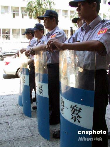 7月21日上午,臺北地方法院開庭審理臺灣地區前領導人陳水扁等被控誹謗案,陳水扁首度以被告身份到庭應訊。臺北市警方動員多名警力會同法警維持場外秩序。中新社發 徐長安 攝