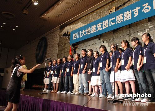 圖為正在東京參加中日青少年交流活動的二十余位來自四川震區的中學生,演唱歌曲《明天會更好》,以表達對日本人民的感謝和重建家園的決心。中新社發 朱沿華 攝
