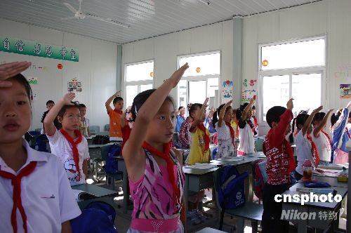 9月1日,四川省兩萬多所中小學(xué)新學(xué)期開學(xué),五十一個(gè)地震重災(zāi)縣的五千九百七十九所中小學(xué)校百分之百復(fù)課。圖為都江堰最大的板房學(xué)校皖川中心校的孩子們?cè)诮淌依锱e行升旗儀式。中新社發(fā) 黃永莉 攝