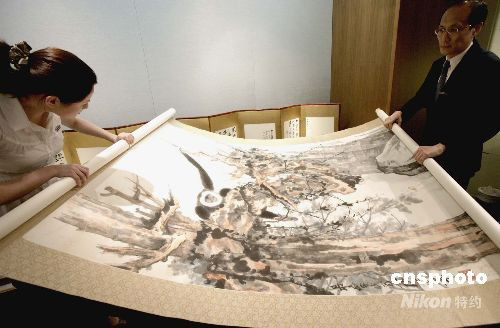 香港蘇富比2008秋季中國書畫拍賣會將于十月六日在香港會展中心舉行,其中吳冠中、張大千作品成為焦點(diǎn)。圖為九月九日舉行的傳媒預(yù)展會上介紹張大千一百一十歲誕辰紀(jì)念專輯之作,于一九五九年的《老樹騰猿》。中新社發(fā) 張勤 攝