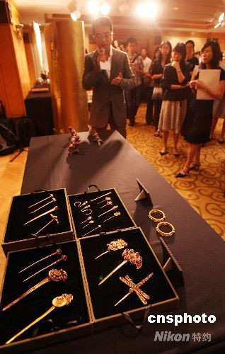 九月十日,香港國(guó)際藝展公司向傳媒展示一套華美精巧的黃金發(fā)飾,估計(jì)拍賣價(jià)在八百萬(wàn)港元。該公司主辦的 “2008香港國(guó)際古玩及藝術(shù)品博覽會(huì)”將在十月四日至七日在會(huì)展中心舉行。中新社發(fā) 洪少葵 攝