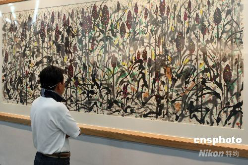 9月10日,2008上海藝術(shù)博覽會(huì)開(kāi)幕。本屆藝博會(huì)吸引了來(lái)自中國(guó)、美國(guó)、法國(guó)等20個(gè)國(guó)家的140余家優(yōu)秀畫(huà)廊前來(lái)參展。圖為吳冠中代表作《高粱》吸引參觀者。中新社發(fā) 湯彥俊 攝