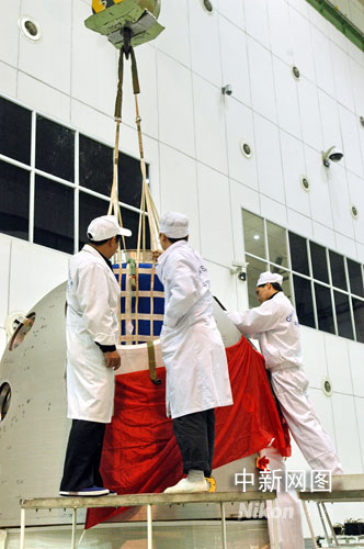 中國神舟七號載人航天飛船發射在即。圖為神舟七號返回艙起吊(資料圖片)。袁明月 攝