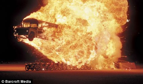 美國拉斯維加斯特技人史蒂夫則駕駛自己的黃色公交校車成功地越過地下擺放有15輛摩托車且還穿過一個巨大的火球,整個跨越距離達33.2米,這也創造了世界紀錄。