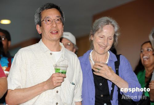 當地時間10月8日下午,美國加州大學圣地亞哥分校醫學院和藥理學系,為剛剛榮獲諾貝爾化學獎的華裔科學家錢永健舉行慶祝會。錢永健和夫人溫迪,以及他的同事、學生等近百人出席。中新社發 張煒 攝