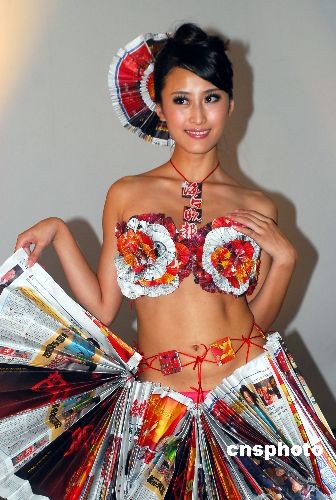 2008年10月11日,海南大學(xué)藝術(shù)學(xué)院05級服裝設(shè)計班學(xué)生用收集的近千份廢舊報紙,運(yùn)用縷空、抽褶、折疊、編織等工藝手法,制成10多套情趣盎然的創(chuàng)意服裝,并由學(xué)生模特穿著走秀。這些服裝是變廢為寶的藝術(shù)品,它利用報紙本身的色彩、圖案和文字表達(dá)張揚(yáng)的個性,展現(xiàn)海南熱帶風(fēng)情。中新社發(fā) 善平 攝