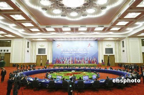 第七屆亞歐首腦會(huì)議在北京人民大會(huì)堂舉行第一次全體會(huì)議,議題是討論國際經(jīng)濟(jì)金融形勢(shì)問題。中新社發(fā) 盛佳鵬 攝