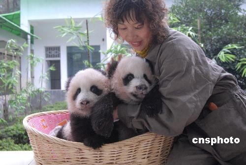 5.12汶川大地震發生時,大熊貓“幗幗”已經懷孕110余天,5月24日“幗幗”被安全轉移至碧峰峽基地,7月6日“幗幗”順利產下一對龍鳳胎。這對龍鳳胎大熊貓成為2008年出生的全球首對大熊貓雙胞胎。為給這對不平凡的熊貓寶寶取一個有意義的名字,中國保護大熊貓研究中心聯合網絡媒體一起發起 “2008全球首對大熊貓雙胞胎征名活動”。10月下旬,中國保護大熊貓研究中心雅安碧峰峽基地歌聲飛揚——2008年全球首對大熊貓雙胞胎百日慶典活動隆重舉行;同時大熊貓研究中心向全球公布了網上投票選出的 “平平”“安安”兩個熊貓幼仔乳名。中新社發 羅小韻 攝