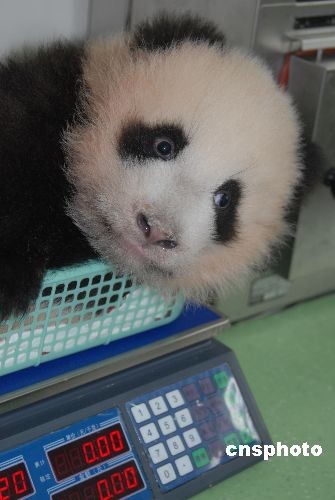 圖為大熊貓幼仔平平(雌性)在稱體重。中新社發 羅小韻 攝