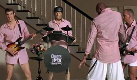 當?shù)貢r間25日,北京奧運八金王菲爾普斯連同NBA巨星科比及楊基棒球隊當紅球星羅得里格斯為美國著名電子游戲《GuitarHero》的最新作品拍攝了新廣告。廣告中,一眾體壇巨星均以粉紅襯衣搭配超短褲組成樂隊亮相。其中,菲爾普斯更是以小內(nèi)褲示人,一向搞怪的他充當吉他手,大秀才藝。而湖人隊當家巨星科比則擔當起樂隊的主唱,一展歌喉。據(jù)悉,此廣告創(chuàng)意是來自1983年由湯姆克魯斯主演的著名舞臺劇《風險行業(yè)》,導演正是大名鼎鼎的好萊塢電影制片人布雷特拉特納。