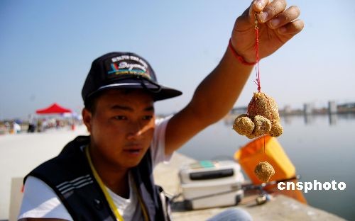 十月二十八日,在福建南安八月湖舉行的第六屆全國農(nóng)運會釣魚比賽正有條不紊進行著。圖為拋桿釣比賽選手做好的魚食尤為有趣。中新社發(fā) 傅丹丹 攝