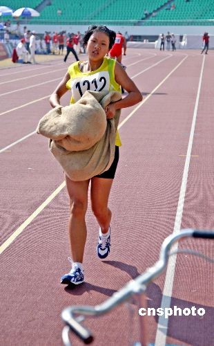 圖為女子60米搶收糧食進(jìn)倉比賽時(shí)選手拿空袋起跑。
