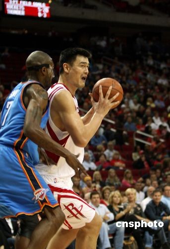 當地時間11月1日晚,美國NBA,休斯頓火箭在主場以89-77擊敗雷霆。姚明貢獻16分11個籃板。赴美治傷的劉翔出現在休斯頓火箭隊主場,觀看老鄉姚明的比賽。中新社發 歐文 攝