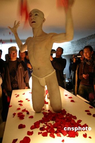 11月2日下午,馬來西亞的華裔舞者李瑞強在北京鼓樓東大街的一家酒吧為大家表演現代舞“人與神”。中新社發 郭海鵬 攝