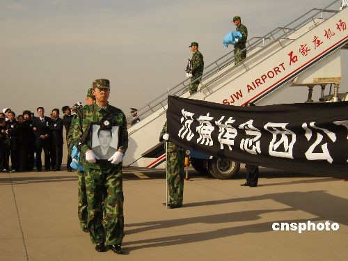 圖為工作人員護送5名遇難中國工人的遺像和骨灰走下飛機。
