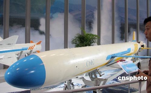 圖為由中國航天科工集團公司研制的C602導彈首次亮相珠海航展,也是該型導彈第一次公開露面。C602是新型遠程反艦導彈,具有射程遠、命中精度高、突防能力強、毀傷威力大、使用靈活、生存能力強等特點,可裝載于機動車輛或水面艦船。中新社發(fā) 孫自法 攝