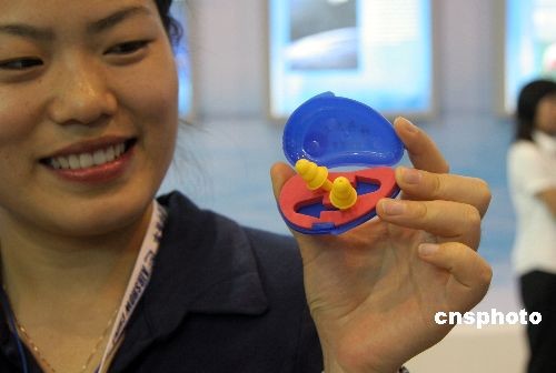 兩年一度的珠海航展已盛裝開幕,一大批新研制的航空航天產品精彩亮相,備受觀眾關注。由中國航天員科研訓練中心研制、注冊商標為“神舟五號”的防護耳塞首次亮相航展,“神舟”五號、六號、七號航天員執行任務時均使用過這種防護耳塞。圖為參展商工作人員向人們展示“神舟五號”防護耳塞。中新社發 孫自法 攝