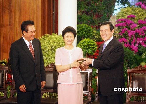 11月6日,臺灣當局領導人馬英九在臺北賓館會見了海協會會長陳云林及協商代表團主要成員、;鶗麻L江丙坤等海基會人員。馬英九致贈給陳云林夫人賴曉華題為《大愛豐收》的琉璃飾品。 中新社發 黃少華 攝 [1] [2] [下一頁]