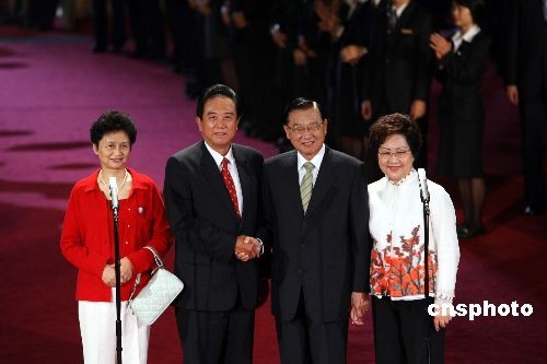 十一月七日,海峽兩岸歷史性的臺北會談圓滿結束,海協會一行在上午乘包機返京。海基會董事長江丙坤在圓山飯店舉行歡送會,為陳云林(左二)送行。中新社發 洪少葵 攝