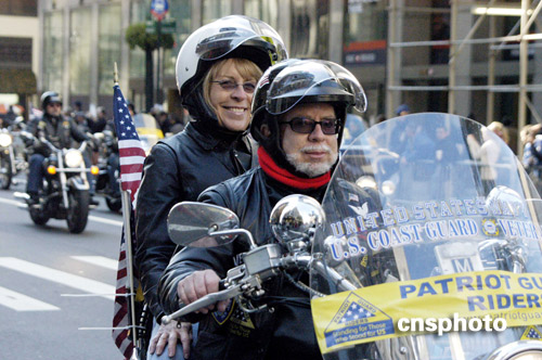 11月11日,紐約在曼哈頓第五大道上舉行一年一度的退伍軍人節大游行,今年已是第90屆。圖為美國退伍大兵威風凜凜地騎行在游行隊伍最前面的摩托車方陣中。中新社發 魏晞 攝