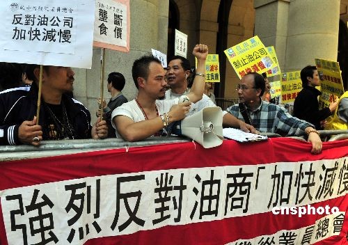 十一月十二日,香港立法會動議辯論,要求政府加強監管油公司價格。有團體的代表,在立法會外請愿。中新社發 譚達明 攝