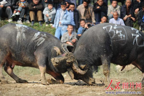 11月11日,貴州雷山縣苗族同胞迎來了一年一度的苗年節,在雷山縣城河灘上,苗族同胞舉行斗牛斗豬比賽歡度苗年節。(吳東俊)