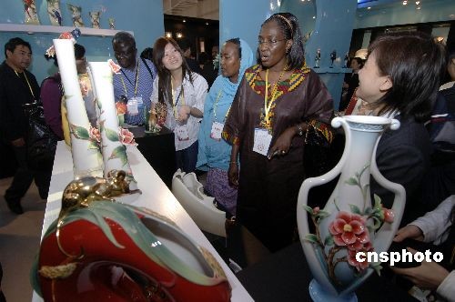 十一月二十七日上午,非洲客人在廈門(mén)文化藝術(shù)中心臺(tái)灣“法藍(lán)瓷”工藝品展館里流連忘返。中新社發(fā) 王東明 攝