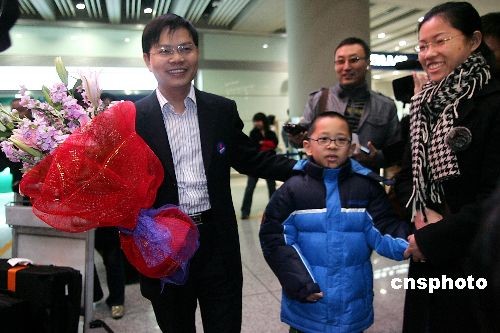 11月30日清晨5點30分左右,滯留泰國的中國公民搭乘中國國際航空公司的CA072航班順利抵達(dá)北京首都國際機場。圖為從泰國返回北京的中國公民黃忠(左)走出機場,他的妻兒到機場迎接。