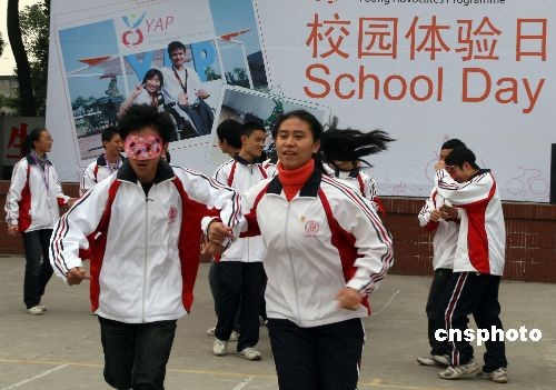 圖:重慶舉行迷你殘奧會 學生體驗盲人賽跑