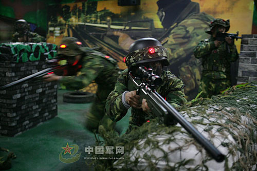 “戰場”氣氛非常逼真。伴著一陣急促的腳步聲,紅方首先發起攻勢。隊長一聲令下,狙擊手迅速占領制高點,機槍手在一個土堆后臥倒掩護,左側兩隊員手持步槍躍過矮墻,就勢一滾隱蔽到一邊。頭上機群盤旋俯沖,身邊爆炸聲此起彼伏,作為前出箭頭的列兵小周一個漂亮的滾進迅速躲過藍軍一串子彈,掩護跟進的小劉緊接著投出一顆手雷,兩名藍軍隊員應聲倒地。小劉心中暗喜,剛要向前方土坎躍進,卻被躲在碉堡里的藍軍狙擊手逮了個正著,頭盔紅光閃爍,無奈退出戰斗。“噠噠噠”一陣急促的槍聲,小周和藍軍李排長短兵相接,雙方同時掏出匕首準備“肉搏”。危急時刻,紅方狙擊手百步穿楊命中李排長,裁判員判李排長“犧牲”。再看小周,盡管是左躲右閃,卻還是被早已埋伏好的兩名藍軍夾擊,小周身上紅光閃閃,被判出局……。經過激烈對抗,這場緊張的戰斗以紅方險勝藍軍而告終。