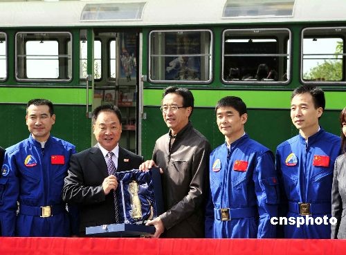 香港旅發局主席田北俊(中)向“神七”訪港代表團贈紀念品。