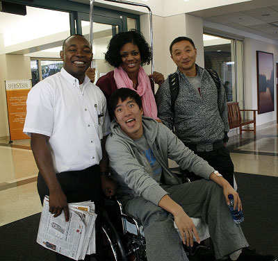 或許是在安靜的醫(yī)院待久了,好動的劉翔一出赫曼紀(jì)念醫(yī)院就沖著所有人做起了鬼臉,那個熟悉的劉翔又回來了。不過劉翔的這次亮相有點不同:“飛人”暫時棲息在輪椅上,右腳還包裹著厚厚的紗布,外面再加上一個高至膝蓋下方的護(hù)具。