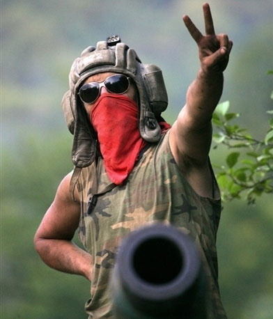 2008年8月14日,一名來自阿布哈茲的士兵在科多里峽谷對鏡頭舉起了象征勝利的手勢。