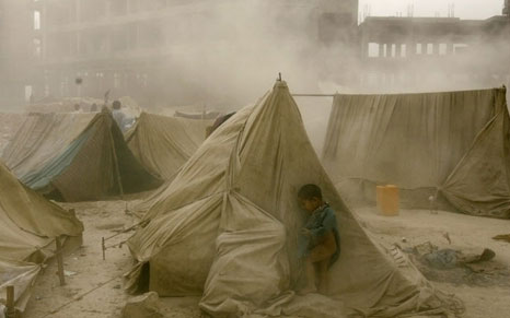2008年10月7日,一名阿富汗難民兒童在沙塵暴中躲在一個難民營地的帳篷后面。