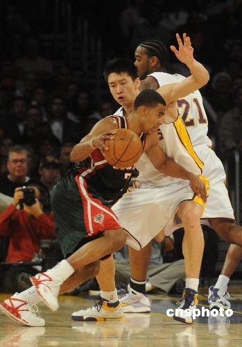 洛杉磯湖人隊在主場以一百零五比九十二輕取雄鹿隊,中國球員孫悅首度在NBA常規賽上登場。圖為孫悅積極防守。中新社發 張煒 攝