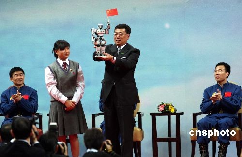 圖為澳門學(xué)子向“神舟七號”載人航天飛行代表團(tuán)贈送航天機(jī)器人。中新社發(fā) 武仲林 攝