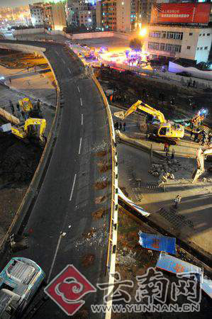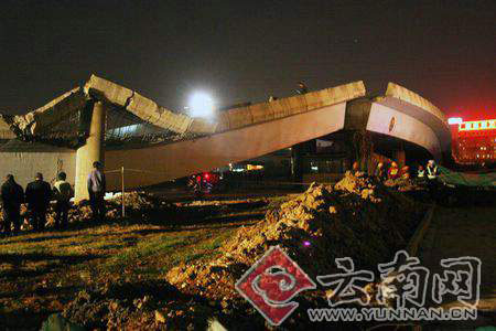 昨日19時30分許,昆明小莊立交橋下昆曲匝道橋在拆除時,發生橋面坍塌。經初步調查,事故造成2人死亡、4人受傷,受傷人員被及時送醫院救治。事故發生后,昆明市張祖林市長、杜敏副市長、陳勇副市長,省交通廳吳衛平副廳長隨即趕到現場組織指揮處置工作,成立事故處置現場指揮部,昆明市公安、衛生、建設、安監、交通等部門工作人員趕赴現場處置,立即啟動《昆明市突發公共事件總體應急預案》及相關部門專項預案,調集昆明市建筑工程應急救援隊到達現場,按有關規程開展現場搜尋、救援、清理、疏通、善后等工作。經專家組現場初步勘查,小莊立交橋拆除中發生坍塌的主要原因屬施工單位違反操作規程,導致被拆除橋梁突然坍塌。目前,事故救援及善后等相關工作正有序進行。